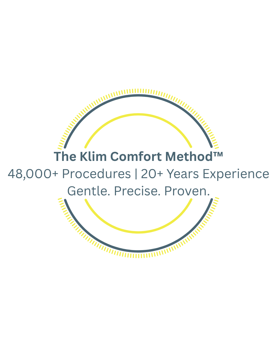 The Klim Comfort Method™ is a proprietary, minimally invasive technique designed to reduce anxiety, improve patient outcomes, and deliver non-surgical pain management in a calm, supportive environment.